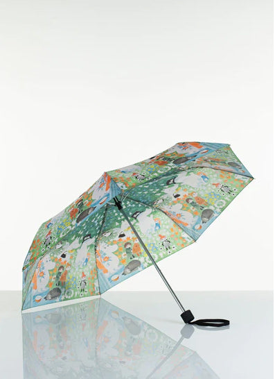 Kuvioinnissa seikkailevat rakastetut Muumi-hahmot, jotka tuovat hymyn sadepäivään. Laadukas Lasessor-rakenne takaa varjon kestävyyden tuulessa ja toistuvassa käytössä. Kompakti koko tekee siitä täydellisen mukaan laukkuun tai reppuun.