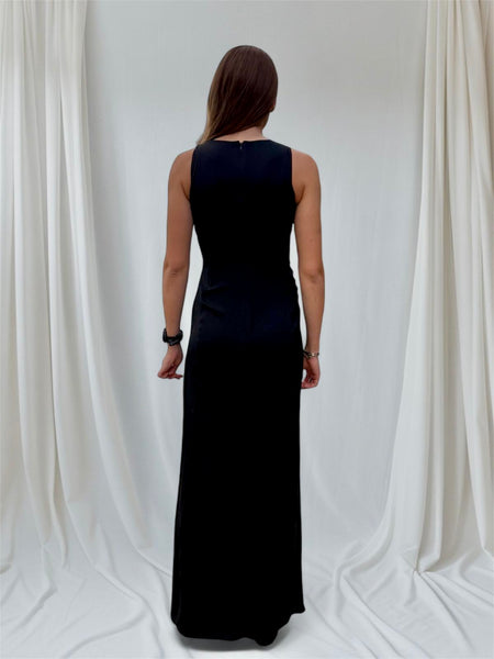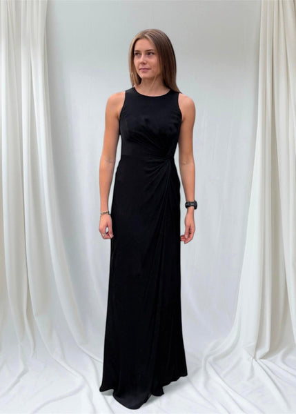 Vuokraa upea Armani Collezionin musta silkkinen iltapuku, joka sopii loistavasti rentoihin kuin virallisempiinkin juhliin. Hihaton malli, minimalistiset leikkaukset ja näyttävä vedostus sivulla.