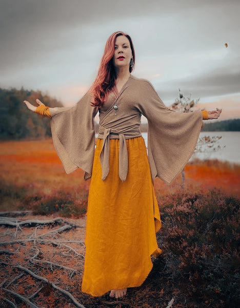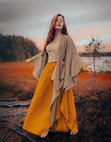 Upea monikäyttöinen merinovillainen Joutsen paita, jossa kaunis liehuva laskeutuvuus. Neulos tanssii mukanasi tuulessa piirtäen vartalon kaaren esiin. Kietaisumalli mahdollistaa paidan pukemisen monella eri tyylillä.
