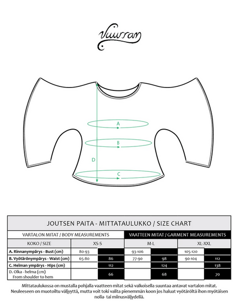 Musta Joutsen paita on kauniisti laskeutuvaa silkkivilla-neulosta (85% merinovillaa / 15% silkkiä). Ohutta ja erittäin joustavaa Suomessa neulottua single-neulosta 180 g/m². Tanssii mukanasi tuulessa, ei krinnaa liikettä. Iholle hellä ja hyväilevä villalaatu, ei kutita tai pistele herkintäkään hipiää.