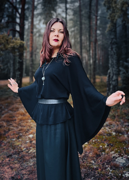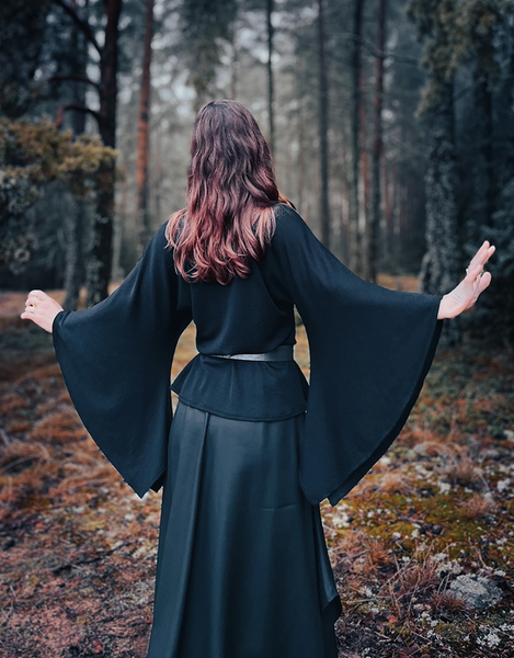 Upea ja dramaattinen musta silkkivilla paita leveillä ja näyttävillä hihoilla.